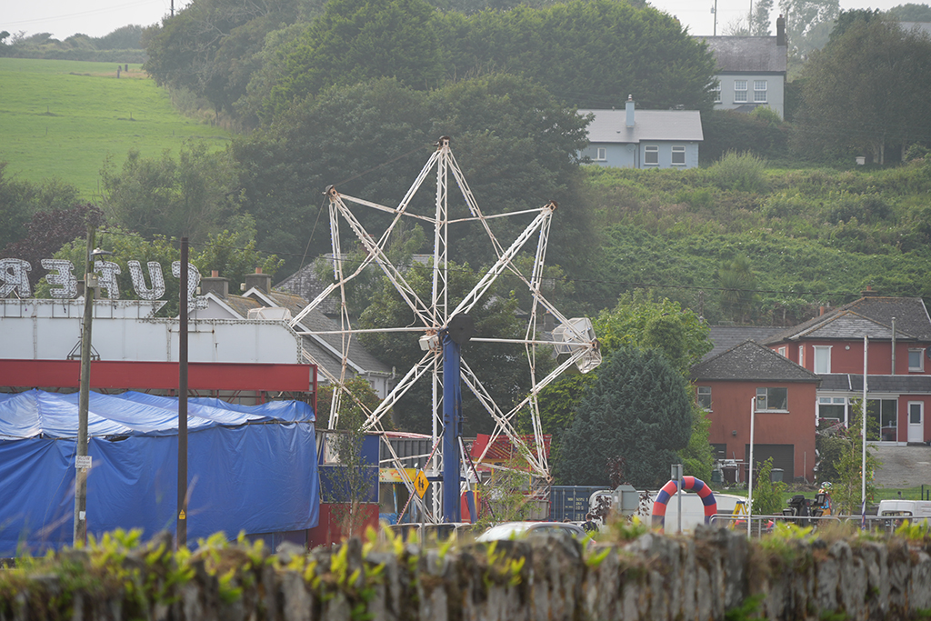 Gegensätze: Das Riesenrad fürs Harvestfestival wird aufgebaut.