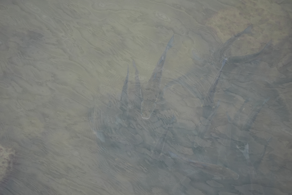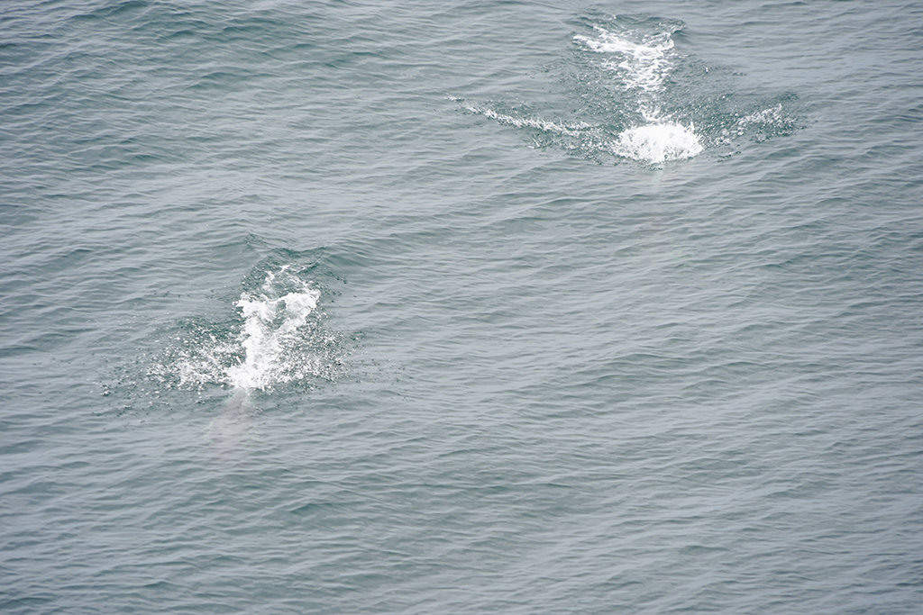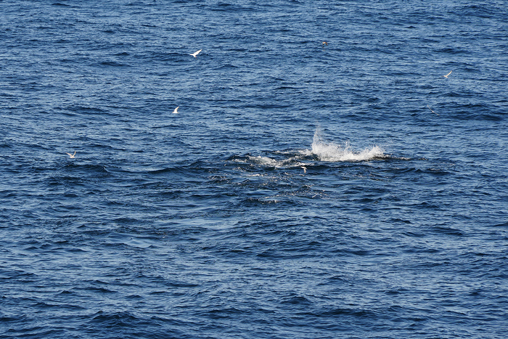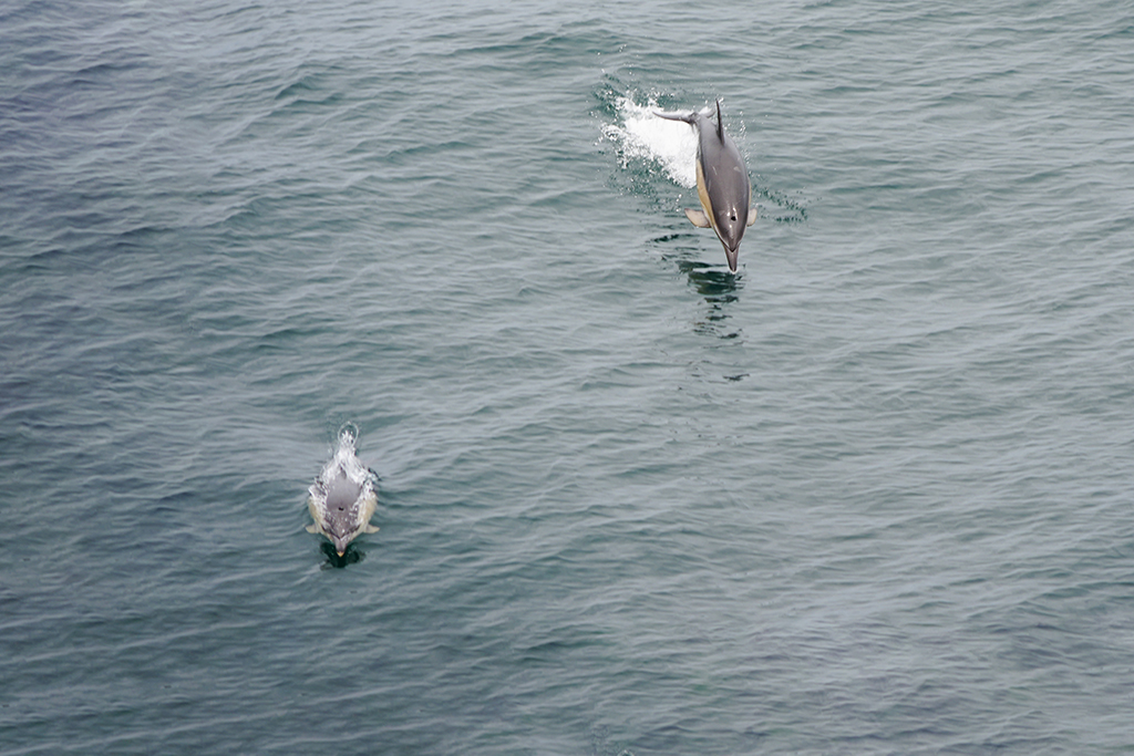 Besondere Freude machen uns Delfine, die während des ganzen Tages mit ihren kleinen Vorstellungen entlang der Fahrrinne für Abwechslung sorgen.