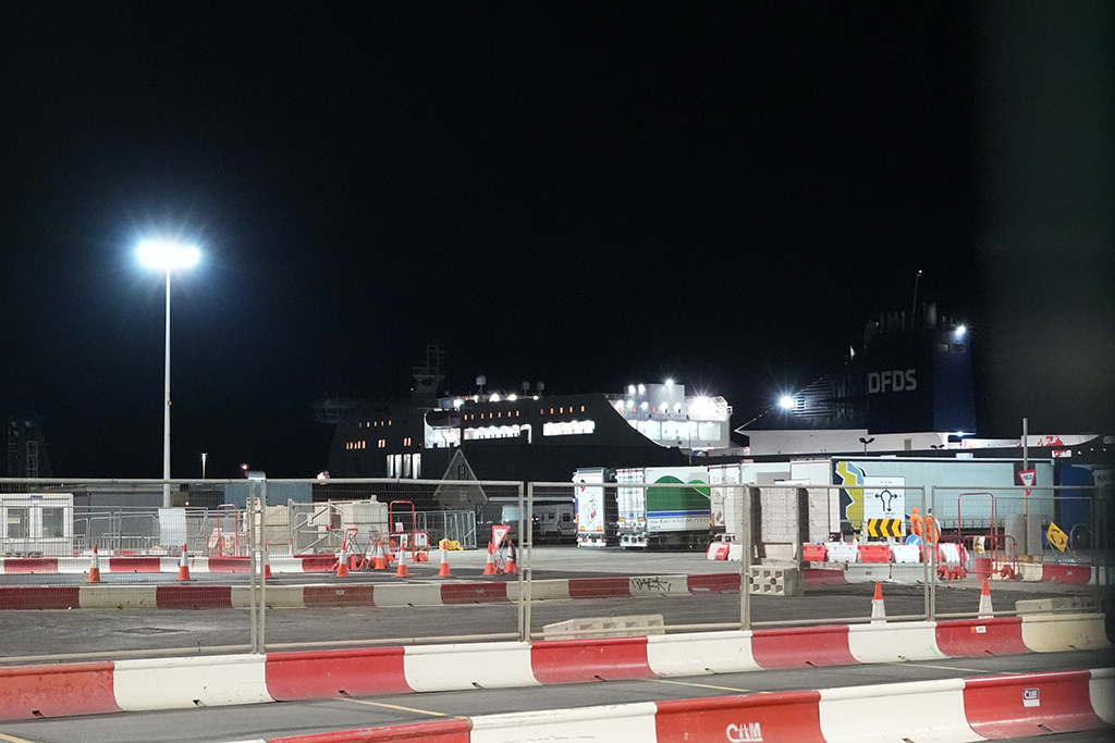 Hinter dem Zaun herrscht nächtliche Betriebsamkeit: LKWs verlassen die Fähre, Trailer werden von Zugmaschinen aus der Fähre geschleppt und zielgenau an ihren jeweiligem Platz zur Abholung bereitgestellt. Bewundernswerte logistische Leistung, die am Hafen Nacht für Nacht erledigt wird. Ein unverzichtbares Kettenglied im europaweiten Handelsverkehr.