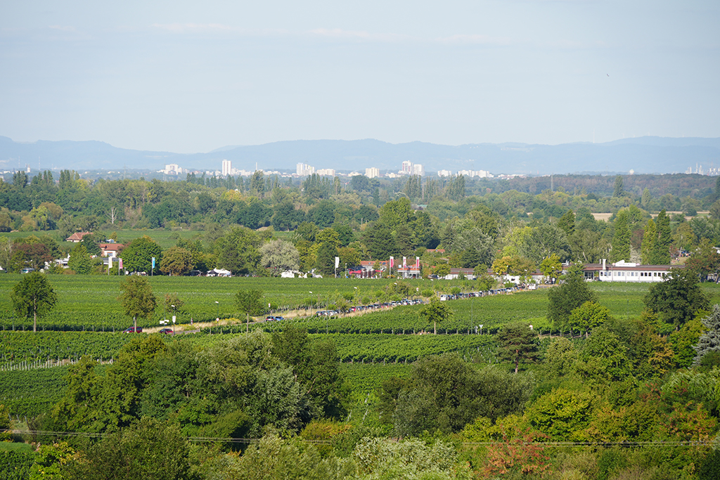 Ludwigshafen in naher Ferne, davor unser Campingplatz. Ein riiiieeeesengroßer Platz, gut versteckt im Gebüsch mit eigenem Badesee.