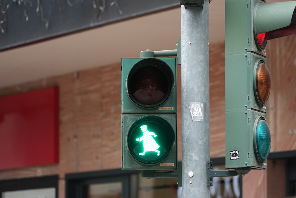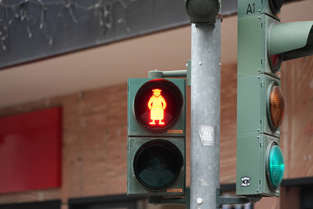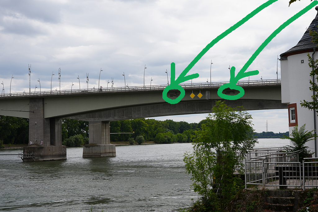 Die extra große Blindenschrift unter der Rheinbrücke garantiert barrierefreien Durchgang.