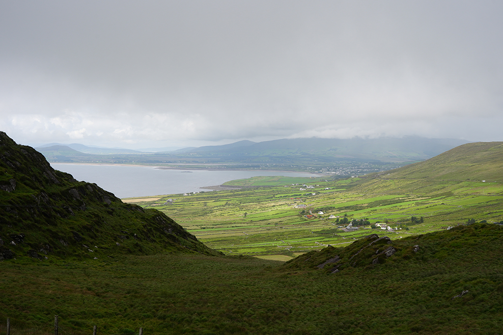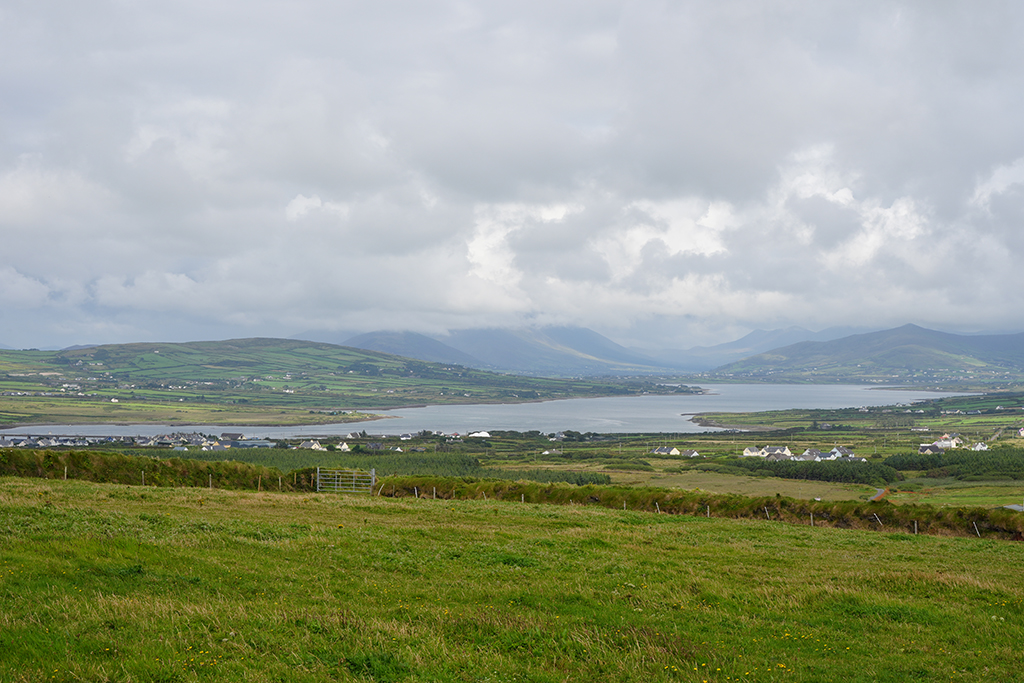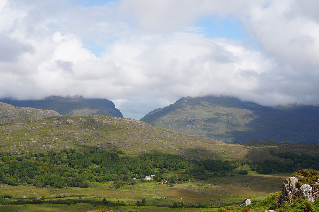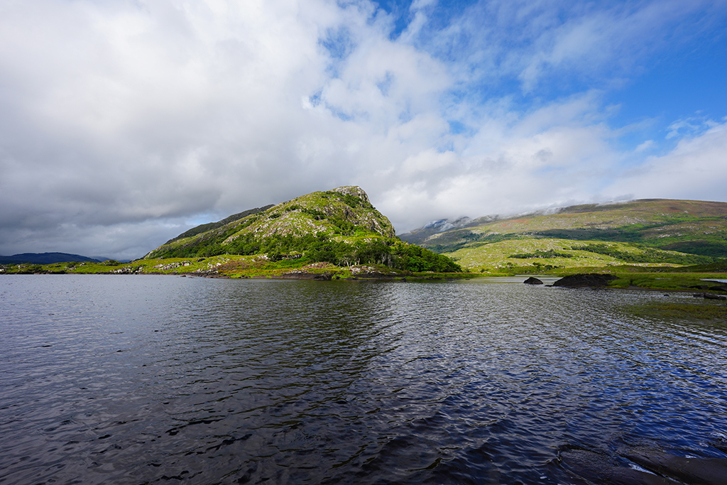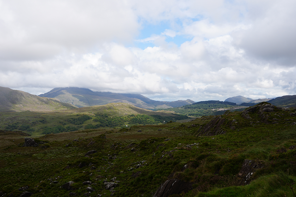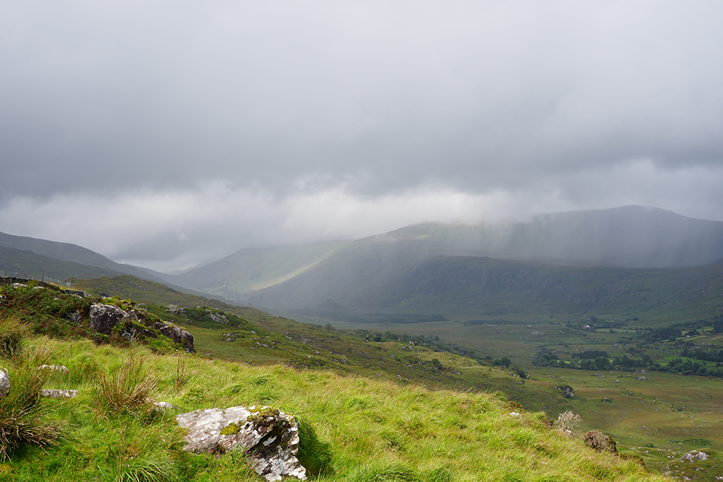 Auf klassische irische Landschaften freuen wir uns heute. Der Himmel hat sich zwar mit reichlich Wolken verkleidet aber fürs Foto ist das oft ganz reizvoll.