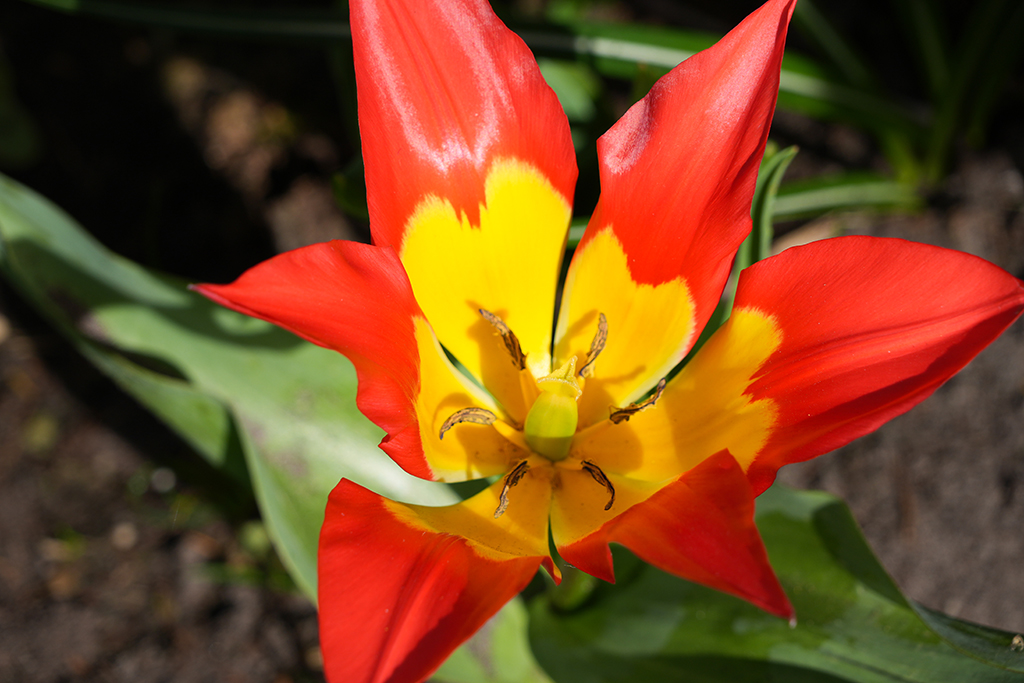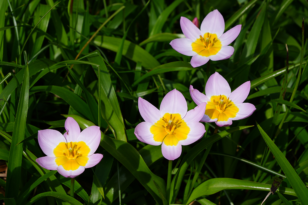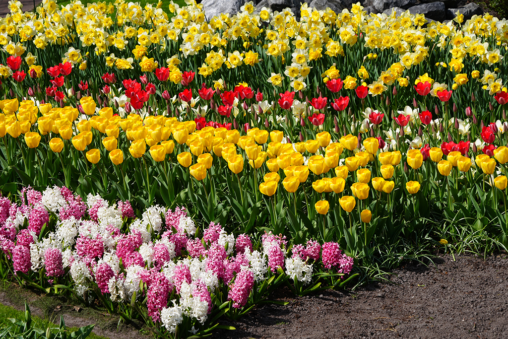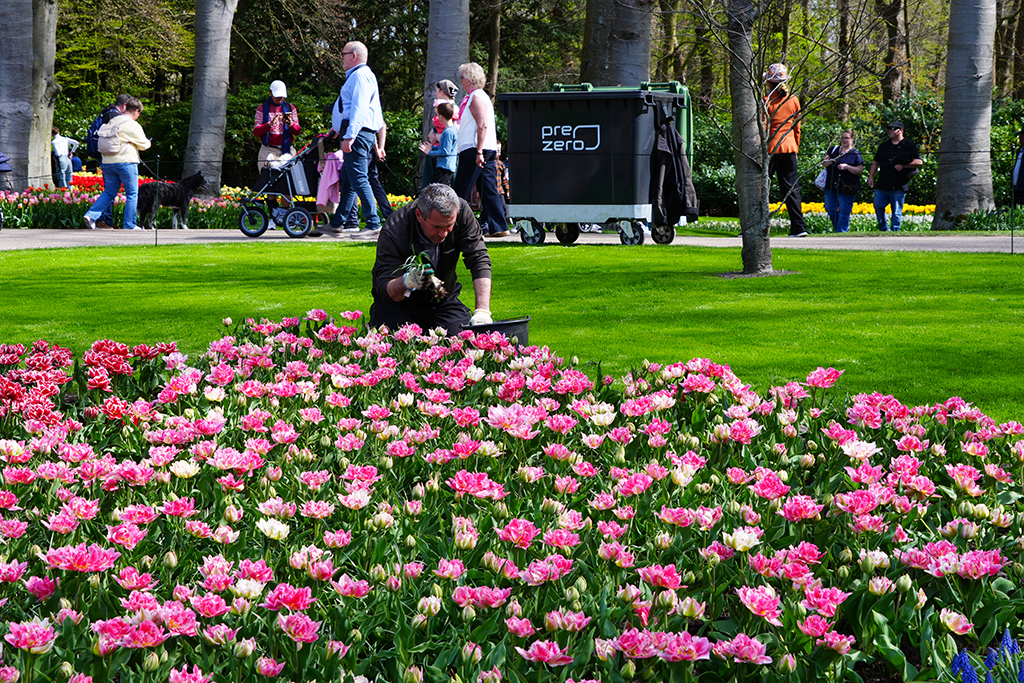 Dieser Gärtner reißt geschickt die verblühten Krokusse aus dem Tulpenbeet.